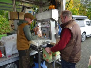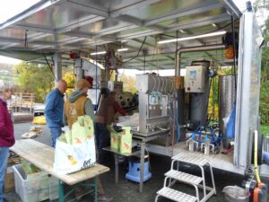 Wer eigene Äpfel oder Birnen mitbrachte, konnte diese gegen eine kleine Gebühr direkt vor Ort verarbeiten lassen, so Thomas Klein. Der Termin für die mobile Obstpresse in Irmgarteichen war lange ausgebucht, die Anmeldelisten lang. Frischer Saft von eigenen Äpfeln schmeckt immer am besten, so Werner Fries, der Gravensteiner und Roten Boskoop geerntet und mitgebracht hatte.